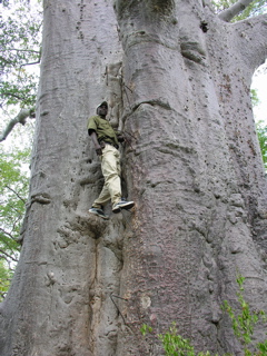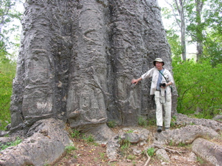Our guide told us the tree was estimated to be over 2,000 years old. We watched as our young guide climbed up the tree and out of sight. The baobab was used many years ago by an invading South African Army as a lookout post. Steel rods were imbedded as climbing aids up the trunk of the tree, and there were scars of old bullet holes and machete marks on its wrinkled bark. We were told elephants eat the bark, and fruitbats pollinate the big white 24-hour blooming flowers. People manufacture paper products from its spongy wood. Animals and people compete for the protein-rich fruit and seed pods, and the leaves are cooked and eaten like spinach. We took too many photos and happily walked away, amazed at what we'd seen.