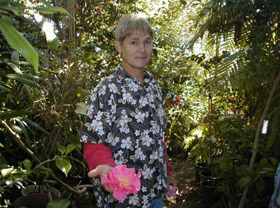 To the great delight of Molly McConnell and her gardening friend from Oceanside, Dean also grows and propagates a wide variety of begonias. After a tour of his gardens and greenhouse, Dean and his wife, Susan, offered us a lovely buffet meal which we ate under one of the sun-screen shelters in his garden; then, he offered to give us cuttings and specific information on propagating begonias and camellias. |